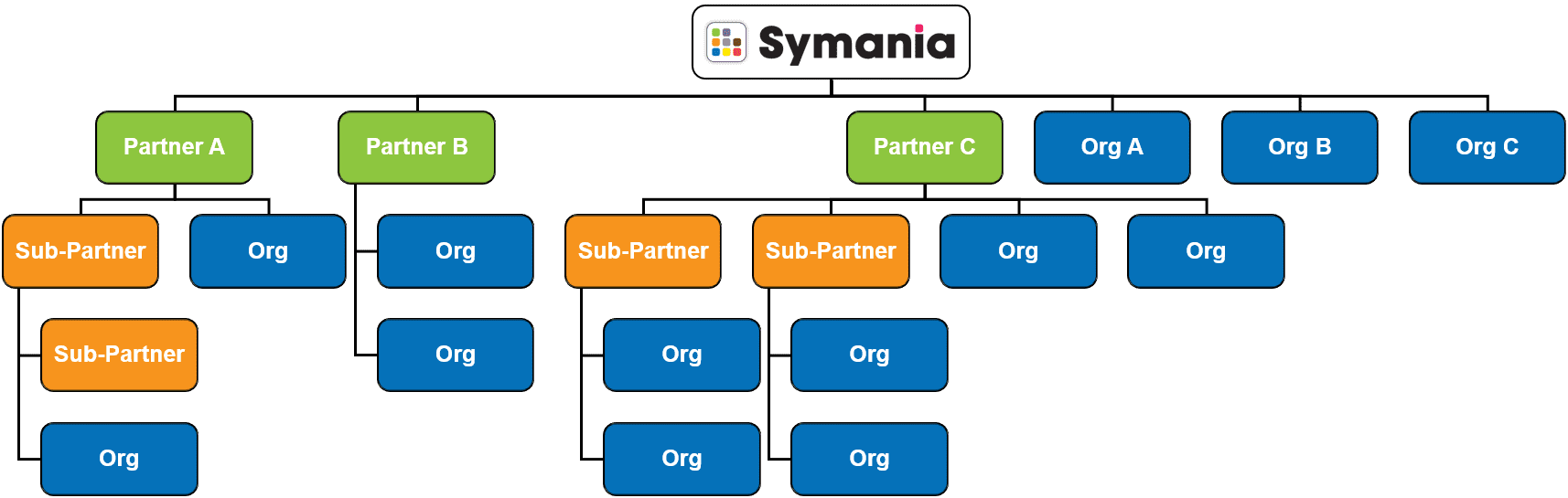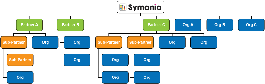 Symania is powered by a dynamic multi-tier architecture that supports a hierarchical structure of Partners, Sub-Partners, and Organizations. Each tier operates with its own management capabilities - overseeing users, organizations, and partner entities with clear permissions and autonomy at every level. This structure provides scalability, flexibility, and secure collaboration, enabling Partners to efficiently manage their business ecosystem within the unified Symania platform.